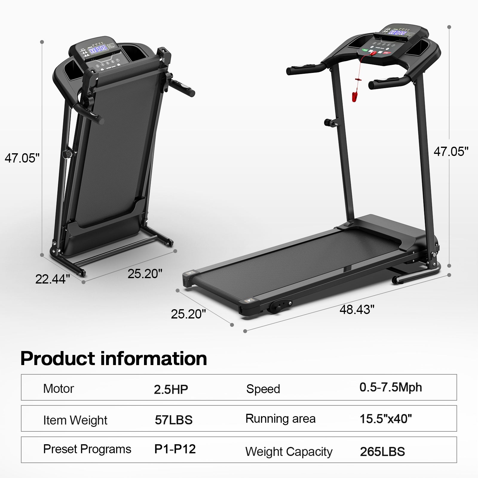 0.5-7.5mph 2.5HP 3 Model 1-12 Programs LED display 1000*390mm 265LBS load-bearing Three-stage adjustment block